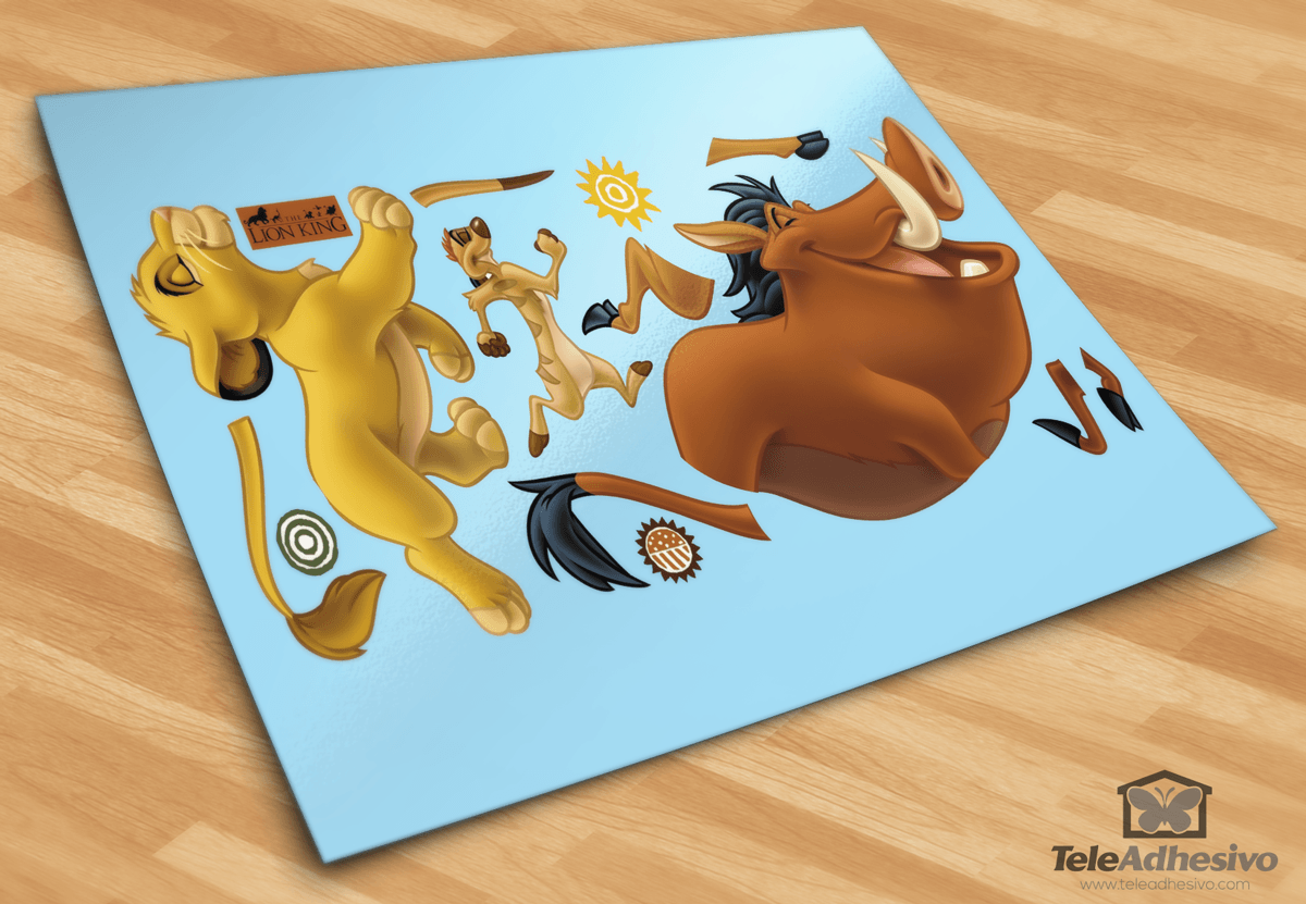 Adesivo murale bambini Simba, Timón e Pumba. Questa bella composizione mostra tre dei personaggi principali del film "The Lion King" di Disney. I 3 di loro camminano di profilo, simulando il momento di cantare "Hakuna Matata". Puoi posizionarli separatamente in completa libertà.