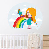 Adesivo murale bambini Ragazza arcobaleno. Una ragazza dai capelli biondi in un abito turchese passa una lettera con un cuore nella busta a un uccello per la consegna. Subito dietro c'è un arcobaleno e nuvole sparse per il cielo. Decora una camera per bambini con questo design a colori.