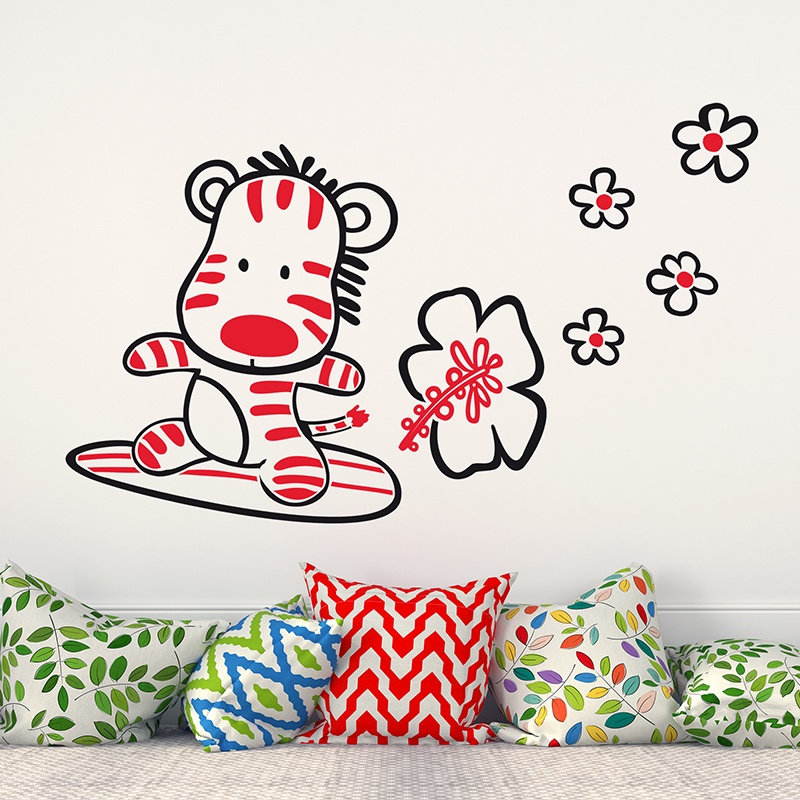 Adesivo murale bambini Navigare vicino alla spiaggia. Un ragazzo biondo, con una tavola arancione e rossa che naviga su una grande onda molto vicino alla riva. Accanto al mare c'è una bella spiaggia con diverse palme. Un'immagine divertente per la stanza dei bambini più i surfisti.