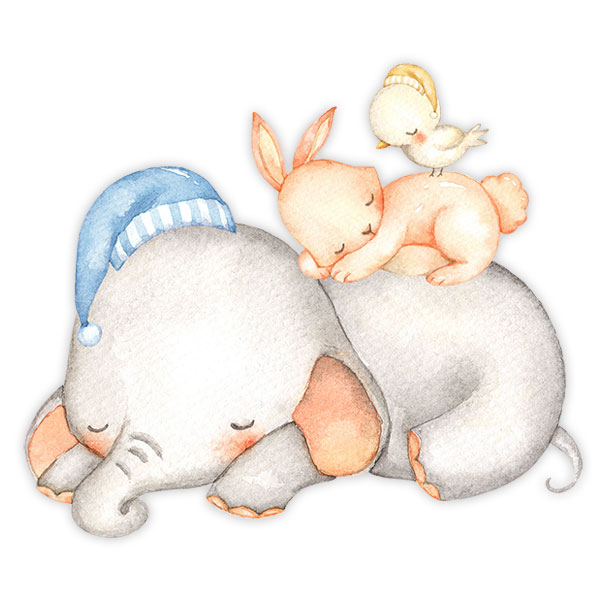 Sticker murale Cane e gatto che dormono. Immagine di questi animali che dormono insieme su alcune foglie di un albero. Amore e tenerezza in un bel design. Entrambi sembrano dormire tranquilli, il gatto tiene su entrambe le gambe, una delle zampe del cane, appoggiata sulle foglie.