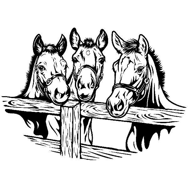 Adesivo murale Tre cavalli. Adesivo di tre bellissimi cavalli dietro un recinto. I tre cavalli guardano dall'altro lato del recinto. Sono quadrupedi con capelli corti e lineamenti muscolari. È un'immagine perfetta per gli amanti degli animali. Selezionare il formato che meglio si adatta voi e il colore.