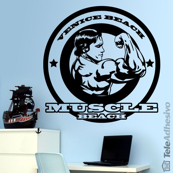 Adesivo murale Arnold Muscle. Logo originale di stile di disegno della famosa spiaggia di Venezia di Los Angeles (Stati Uniti). Conosciuto anche come Muscle Beach. In cui non poteva mancare il braccio mostrando di attore Arnold Schwarzenegger nel suo tempo come un bodybuilder.
