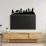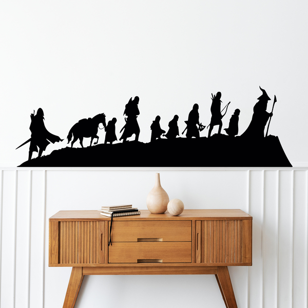 Adesivo murale Skyline Il Signore degli Anelli. Design dove appaiono i personaggi principali del romanzo scritto da J. R. R. Tolkien, al grande schermo che ha preso Peter Jackson. Racconta il viaggio del protagonista principale, Frodo Baggins, lo hobbit della Contea, per distruggere l'Unico Anello.
