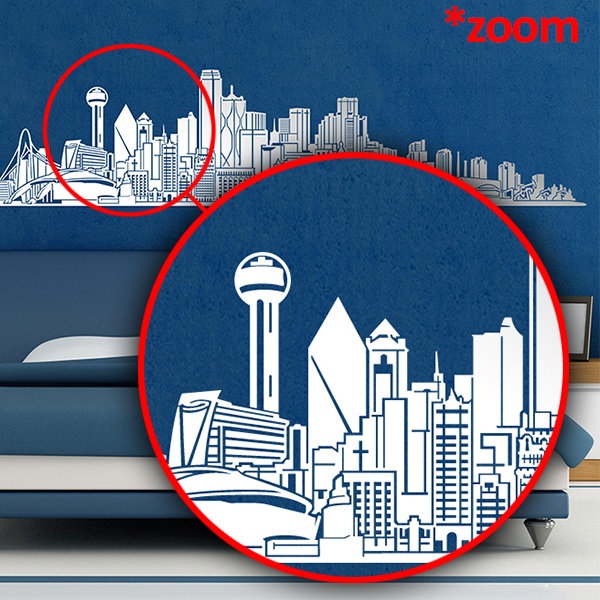 Adesivo murale Dallas Skyline. Si trova nello stato del Texas (Stati Uniti), essendo la quarta area metropolitana più grande del paese. Punti salienti dei suoi grandi edifici, come la Torre di Bank of America Plaza, Renaissance Tower, Comerica Bank, JPMorgan Chase Tower, Fountain Place o il Trammell Crow Center.