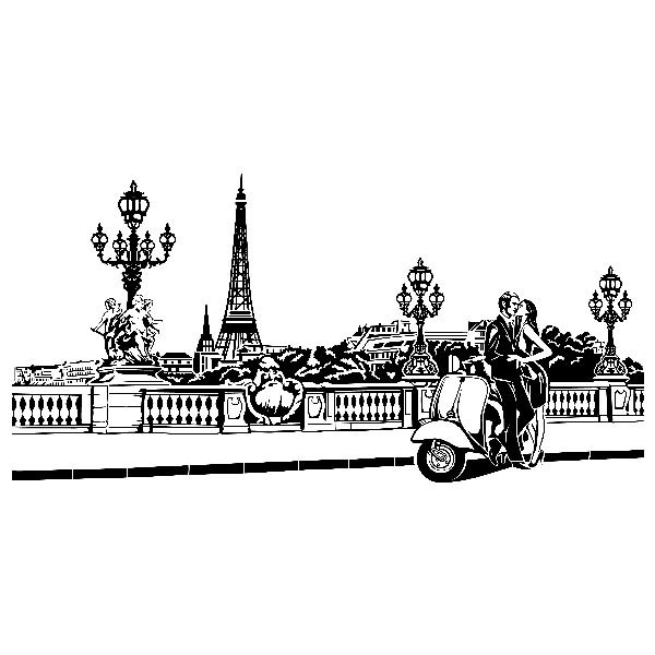 Adesivo murale Scena romantica a Parigi. Coppia in amore su uno scooter Vespa in uno dei ponti che attraversano il fiume Senna. Parigi, città d'amore, in lontananza si può vedere la torre Eiffel tra gli edifici della città. Il ponte ha una decorazione classica molto ostentata.