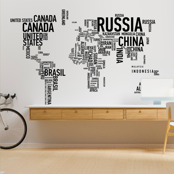 Adesivo mondo tipografica. Un grande disegno tipografico di una adesivo mondo con i nomi dei paesi che rappresentano l'intera superficie terrestre. Un modo originale e diverso per decorare la vostra casa, così come per imparare i paesi del mondo sempre in vista.
