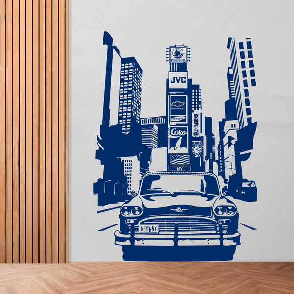 Adesivo murale Taxi di New York. Il mitico taxi "Checker" a Times Square, nel centro di New York. Sullo sfondo dell'edificio "One Times Square", lo spazio pubblicitario è più costoso del mondo. Prudential, JVC, Samsung, Coca Cola e Dunkin Donuts sono alcuni dei marchi pubblicizzati.
