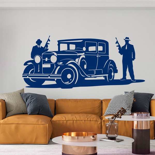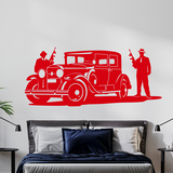 Adesivo murale Bande di Al Capone e Cadillac. È la berlina Cadillac Town del 1928, di Al Capone. La storia di questa vettura è molto ampia, è una delle prime auto blindate mai esistite, è stata mimetizzata tra auto della polizia ed è stata messa all'asta più volte.