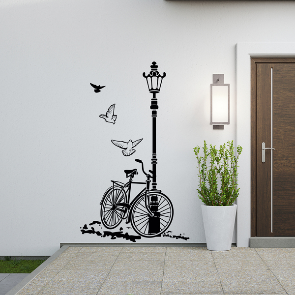 Adesivo murale Bicicletta e lampada. La bicicletta è un mezzo di trasporto sano, ecologico e molto economico. Il suo uso è diffuso in quasi tutta l'Europa. Poco ha cambiato il suo design del 1885. Qui lo abbiamo supportato da un lampione, design perfetto per dare un tocco accogliente al nostro muro