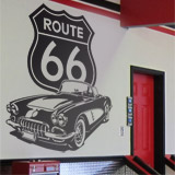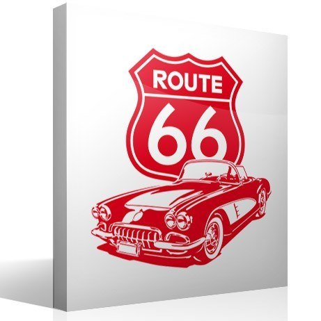 Adesivo murale Corvette Route 66. Route 66 è una delle rotte federali originali, che vanno da Chicago passando per il Missouri, il Kansas, l'Oklahoma, il Texas, il New Mexico, l'Arizona e la California, finendo a Santa Monica, Los Angeles. La Route 66 non ha mai raggiunto l'oceano.