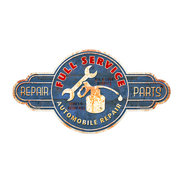 Adesivo Murale Full Service Repair Parts. Originale poster decorativo retrò di un classico negozio di riparazione auto americano in cui si può vedere un'insegna con strumenti meccanici su uno sfondo blu usurato. Decora le stanze più speciali della tua casa o della tua azienda con questo incredibile adesivo e ottieni una decorazione unica e molto suggestiva.