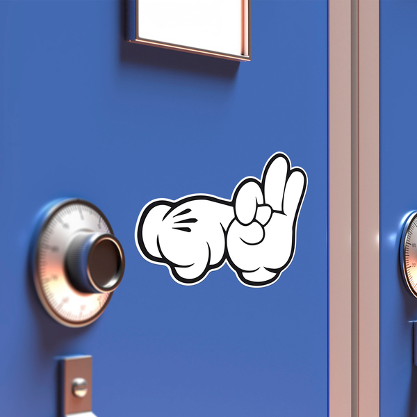 Adesivo Mickey Hands. Design dei famosi guanti che Michey Mouse ha nelle sue mani, il personaggio principale di Disney. L'espressione delle mani è oscena, per ciò che rappresenta. Un adesivo ideale per decorare la tua tavola da surf, skateboard o laptop, se sei un piccolo teppista.