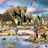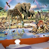 Fotomurale animali della giungla II. Uno stagno nel cuore dell'Africa, vari alberi e vegetazione circondano un gran numero di specie animali tra le più varie. Possiamo trovare il re della giungla con i suoi cuccioli, elefanti, zebre, un ippopotamo, un rinoceronte, uno gnu, giraffe e altri ancora.
