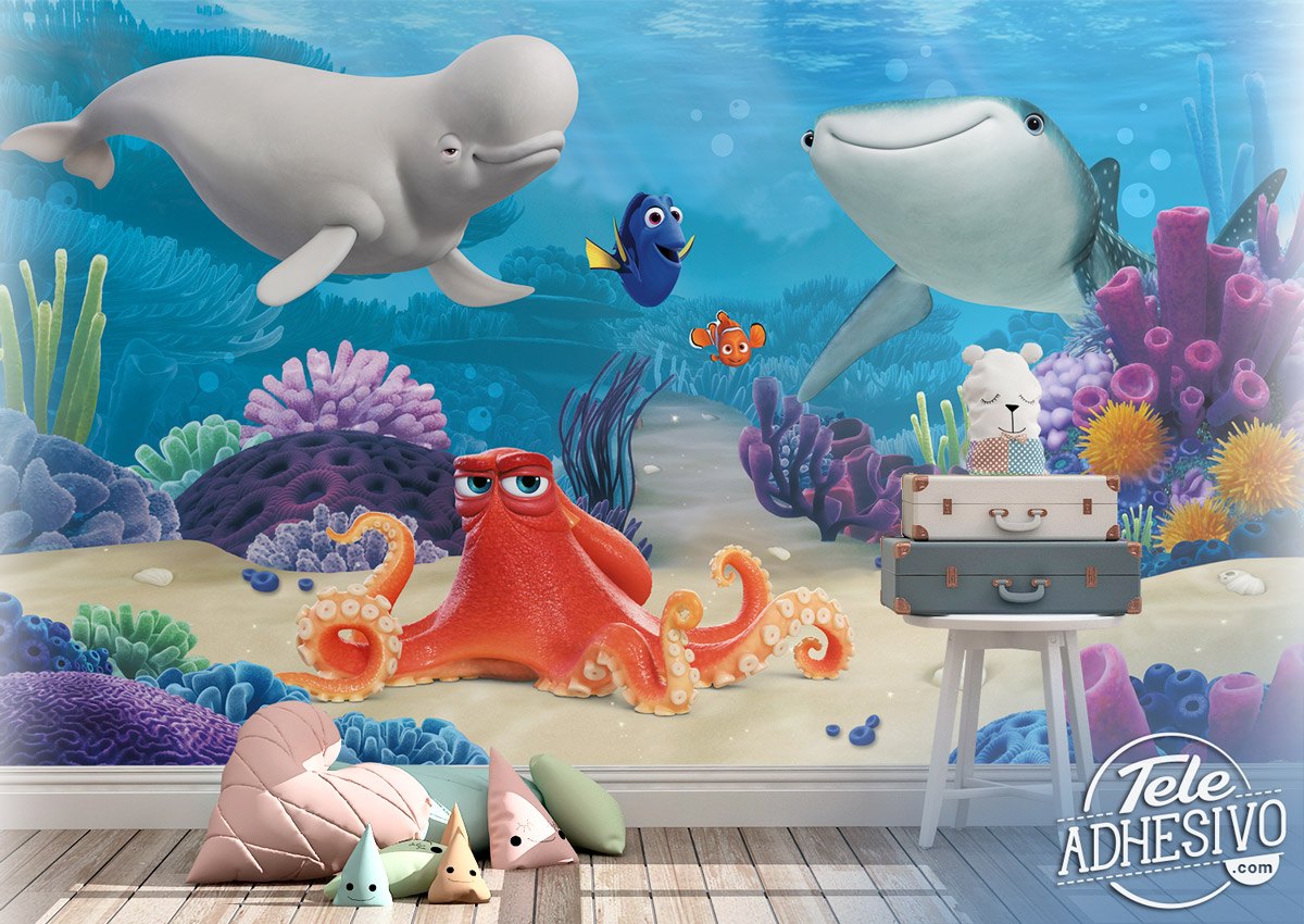Fotomurale Nemo e gli Amici in Fondo al Mare. Originale murale decorativo del popolare sequel Disney Finding Dory, in cui possiamo vedere la divertente Dory insieme ai suoi compagni del fondo marino. Realizzato con materiali di alta qualità, questo accattivante murale adesivo è disponibile in diverse dimensioni e finiture decorative.