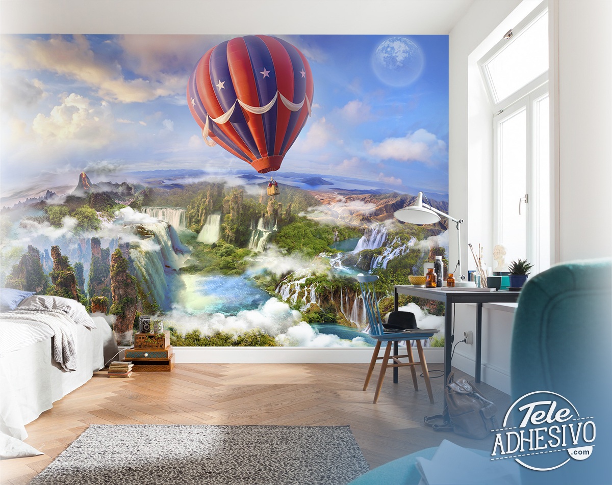 Fotomurale Sunrise mongolfiera. Bellissima immagine di una mongolfiera che vola sulle nuvole, all'orizzonte inizia ad uscire un'alba. Sullo sfondo c'è una grande luna con un cielo ancora buio in cui ci sono migliaia di stelle. Vediamo che il pallone è appeso a un'ancora.