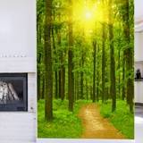 Fotomurale Tramonto nella foresta. Immagine in cui il sole si nasconde fino al giorno dopo tra gli alti alberi, una strada sterrata si fa strada tra di loro. Una bella immagine di colori verdastri e marroni in cui mostra quanto può essere bella la natura.