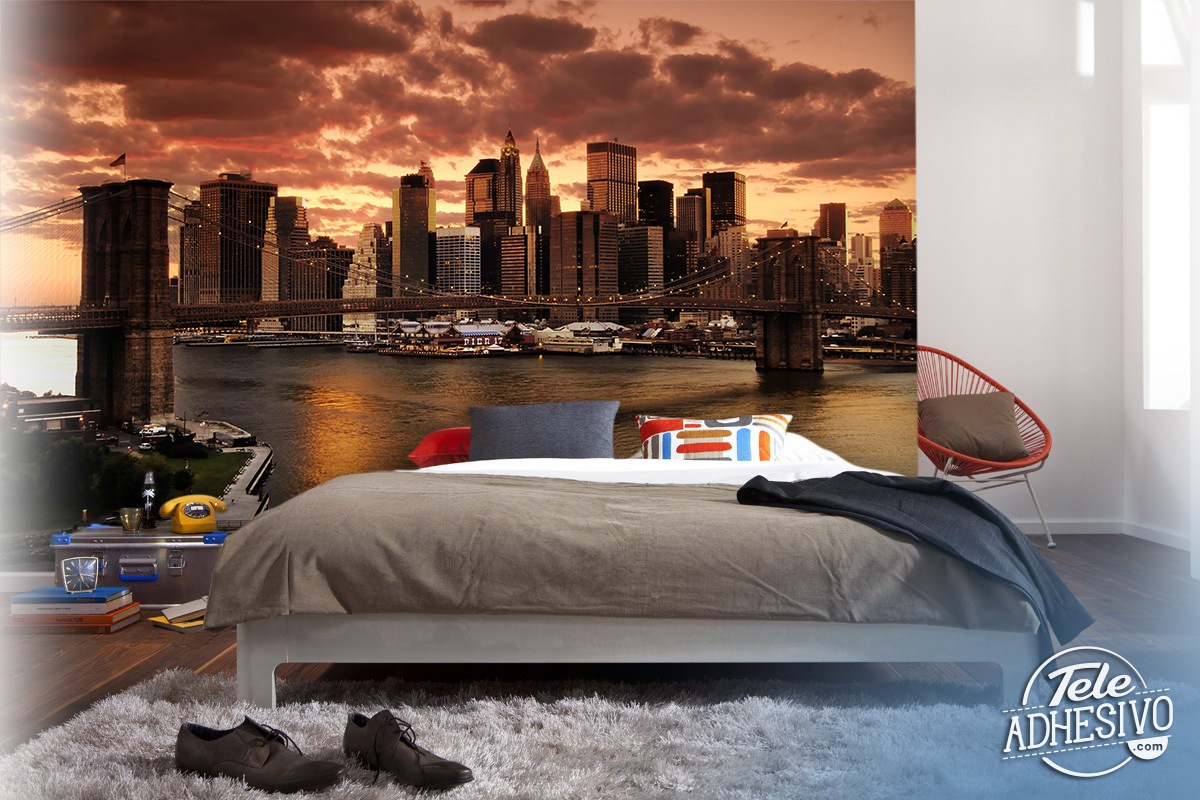 Fotomurale Il centro di Manhattan al tramonto. Bellissima immagine aerea degli edifici del centro di Manhattan contaminati dal riverbero del sole. Tra questi c'è l'Empire State Building. Situato sulla Quinta Strada. Fu costruito nel 1931, fino al 1972 era l'edificio più grande del mondo.
