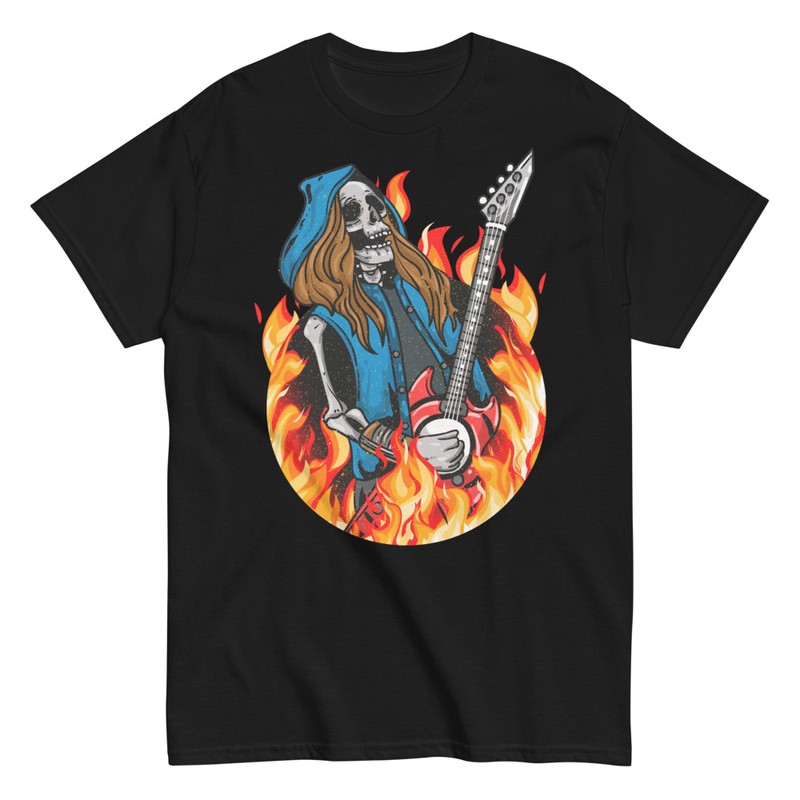 Scopri la maglietta rock perfetta per gli appassionati di heavy metal. Questo design unico presenta uno scheletro rocker con una chitarra elettrica, avvolto dalle fiamme, ideale per chi vive e respira musica rock. Realizzata con materiali di alta qualità, questa maglietta offre comfort e stile. Perfetta per concerti, festival o semplicemente per mostrare la tua passione per il rock ovunque. Prendi la tua e porta con te lo spirito del rock!